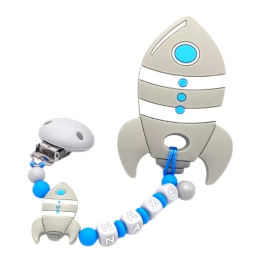 Silikon-Beißkette für Jungen in Grau mit Raketenmotiv zur Zahnungslinderung