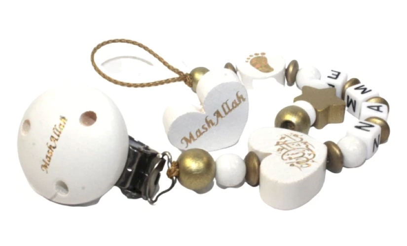 Unsere Schnullerkette MashAllah ist ein praktisches und personalisiertes Geschenk zur Geburt, Taufe oder Babyparty. Jede Kette wird handgefertigt.